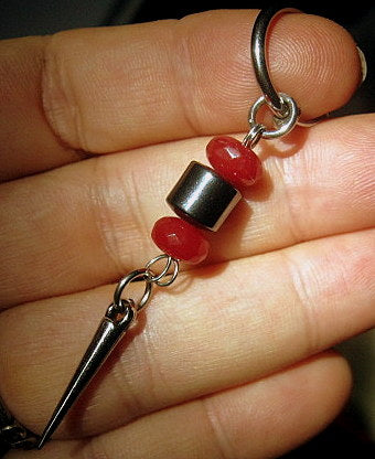 Earring RUBY & Hematite cylinder stone, spike, Dangle Hoop/ clip on black, stone Handmade earring men gift