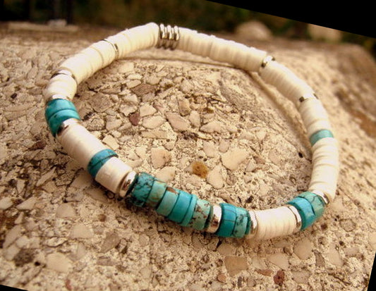 Men African TURQUOISE Bracelet white african style polymer heishi, silver hematite Healing stone, handmade bracelet men gift