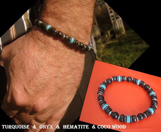 Men Bracelet TURQUOISE, Coconut Wood heishi ONYX Hematite Protection stone, handmade bracelet men gift