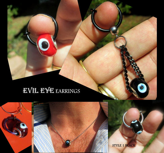 Men Earring EVIL EYE for protection, donut , Dangle Hoop/ clip on black, Handmade earring men women gift