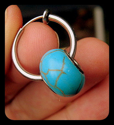 Men Earring TURQUOISE, donut, Dangle Hoop/ clip on black, Handmade earring men women gift