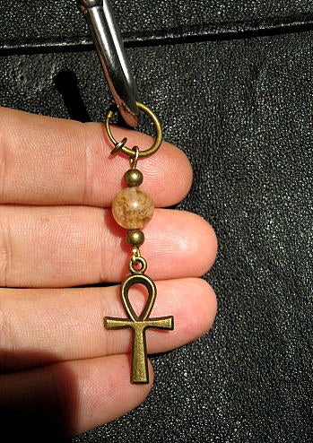 Men Earring Citrine stone-Full moon, ANKH cross Protection Dangle Hoop/ clip on bronze earring, Handmade earring women men gift