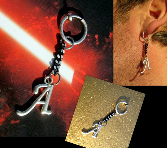 Men Earring silver Initial, black chain, stainless steel, Dangle Hoop/ clip on earring, Handmade earring women men gift