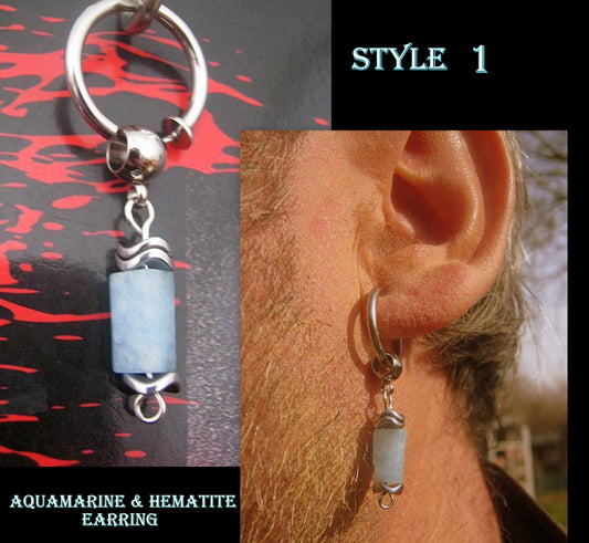 AQUAMARINE stone Hematite men Earring Hoop/ Clip on dangle unisex mono earring, Handmade earring men gift