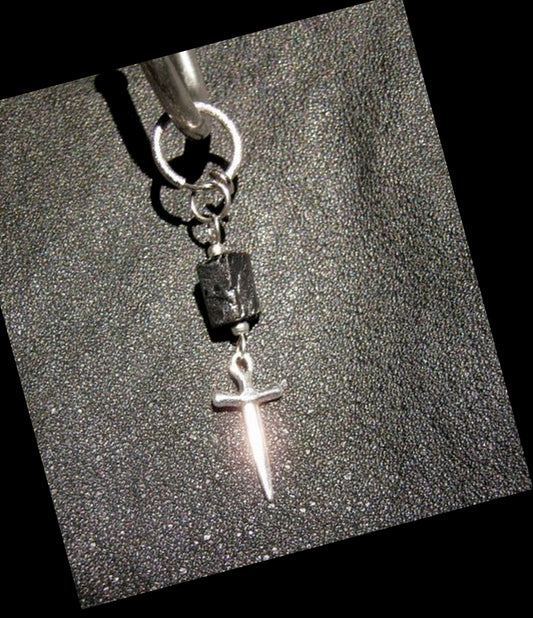 Men Earring raw TOURMALINE stone- Protection, silver Sword, Dangle Hoop/ clip on earring, Handmade earring women men gift