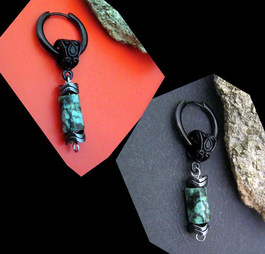 Men Earring African turquoise & Hematite stone, Dangle Hoop/ clip on black, stone, Handmade earring men gift