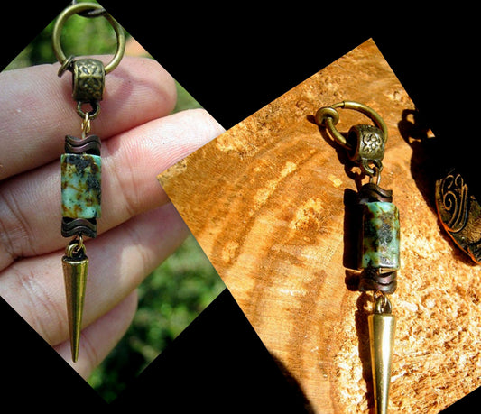 Men Earring African turquoise & Hematite stone bronze Spike Dangle Hoop/ clip on, Handmade earring men gift