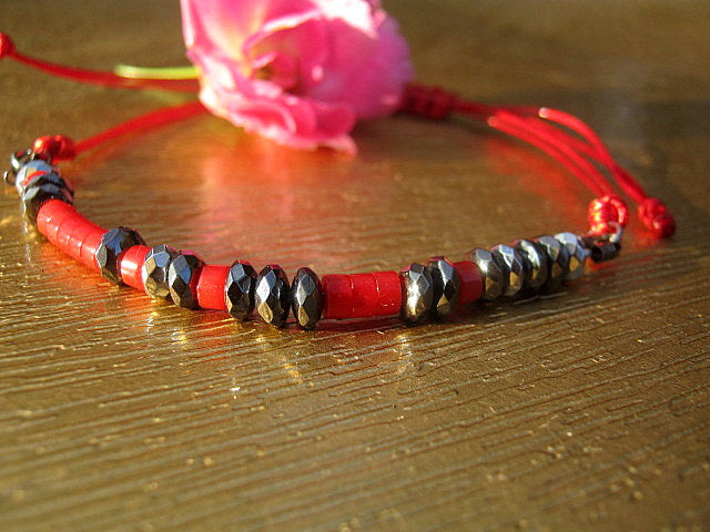 The bracelet combine wax vegan cord adjustable / slice knot whit high quality RED CORAL and with silver, & black Hematite, Coco wood, Onyx, gemstone beads/4mm and tibetan silver fancy tube .