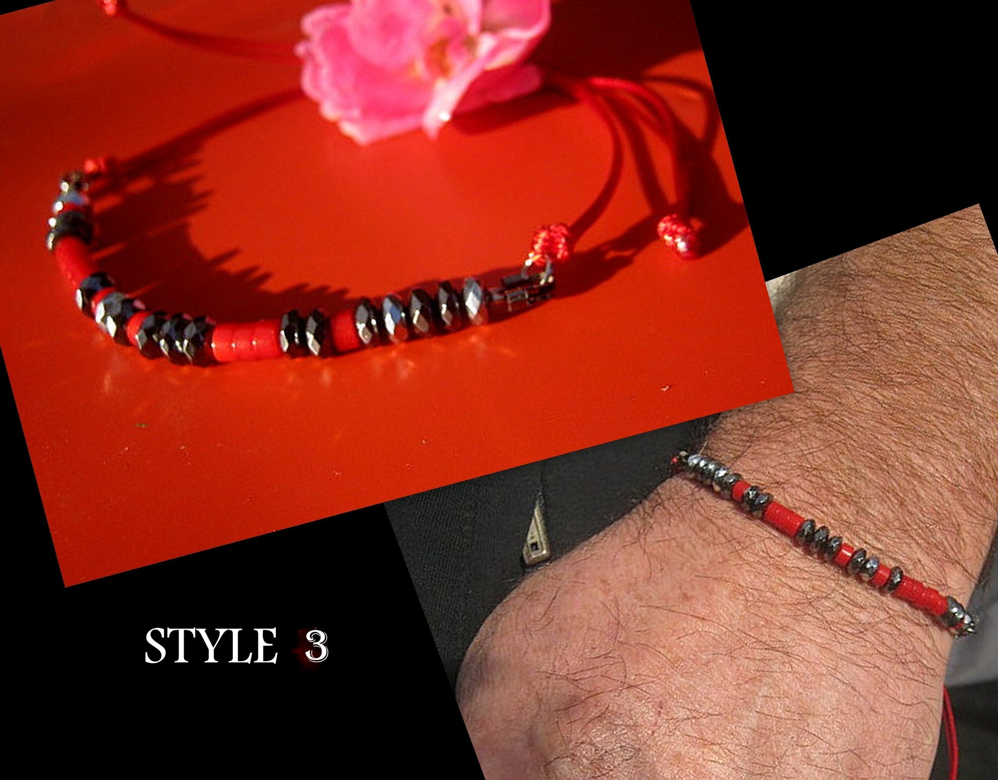 -1 bracelet - cord black, Hematite faceted black &silver, and coral red heishi -style.3