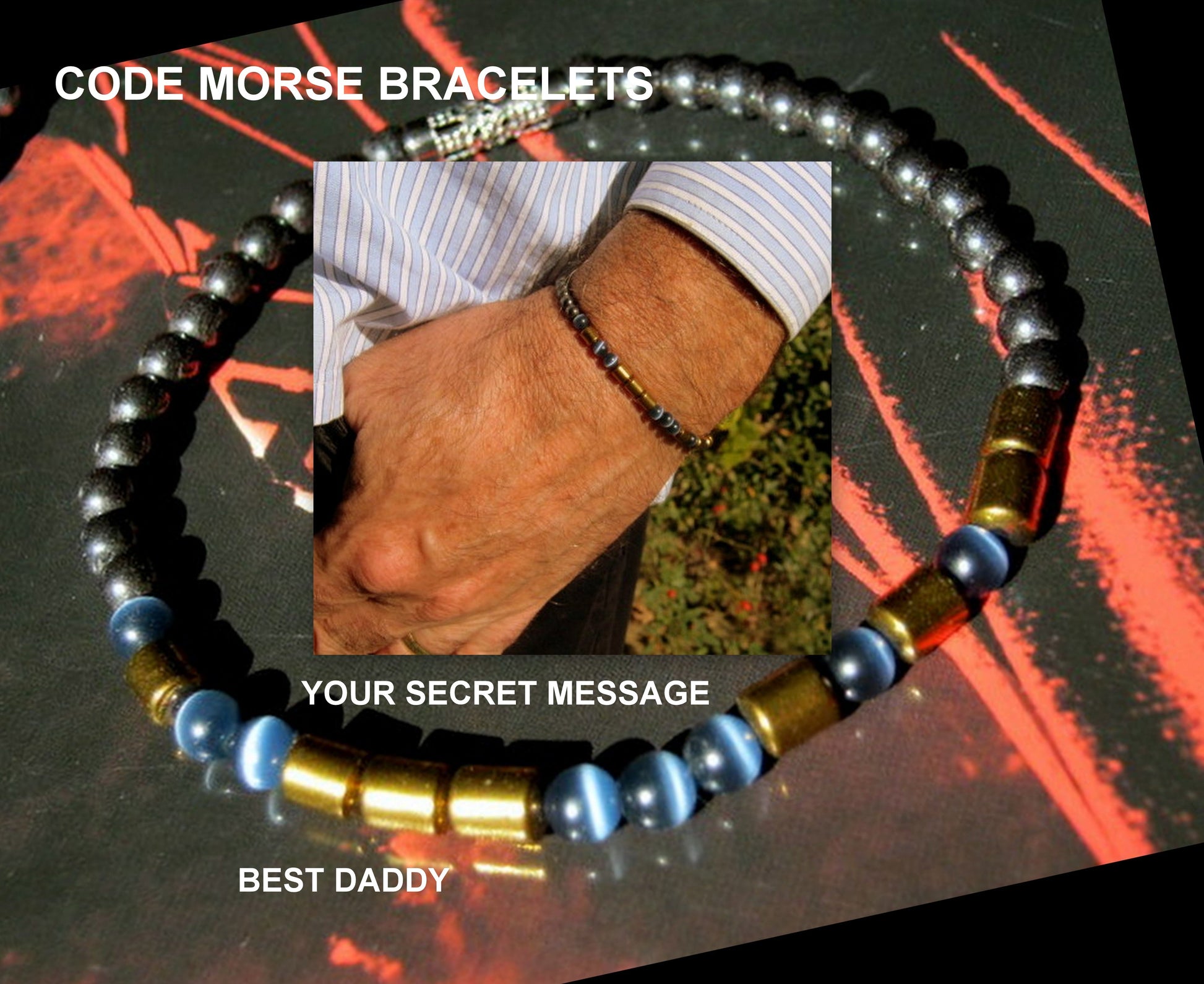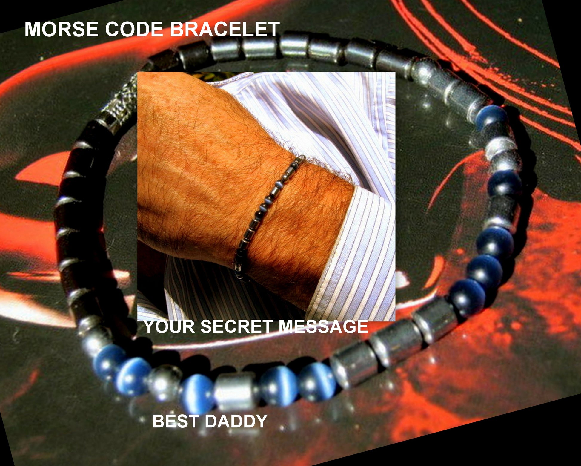 A contemporary bracelet sends a secret message in Morse Code – perfect if you’ve been searching for a unique, personalized gift . You could use it to ask your best friend to be your best man, or to tell your partner you’re expecting a baby, for an anniversary or special birthday gift. is a great gift idea or a special treat for yourself. (delivered in a beautiful packaging ) Made from high quality Opal, Blue Cat eye, silver & black Hematite , gemstone beads/4mm and a stainless steell fancy tube .