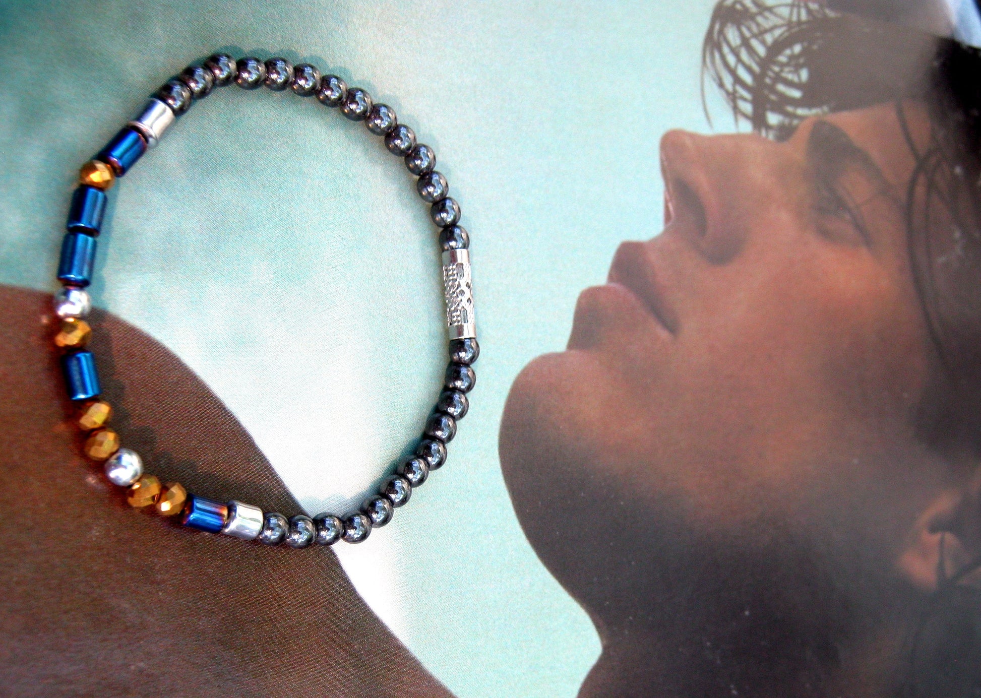 - 1 bracelet gold, silver, black and blue Hematite - 4 mm