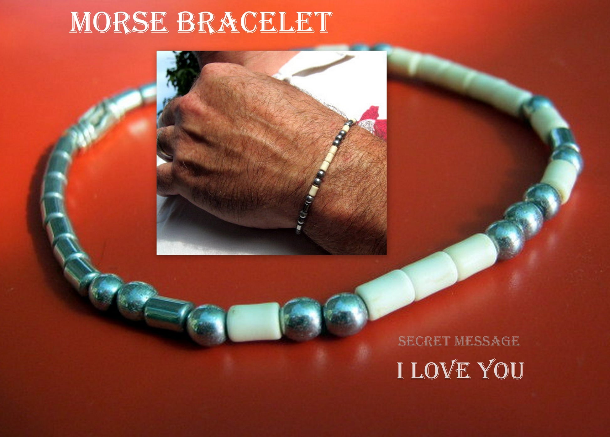 A contemporary bracelet sends a secret message in Morse Code – perfect if you’ve been searching for a unique, personalized gift . You could use it to ask your best friend to be your best man, or to tell your partner you’re expecting a baby, for an anniversary or special birthday gift. is a great gift idea or a special treat for yourself. (delivered in a beautiful packaging ) Made from high quality white Coral , silver, blue, black Hematite gemstone beads/4mm and a tibetan silver fancy tube .