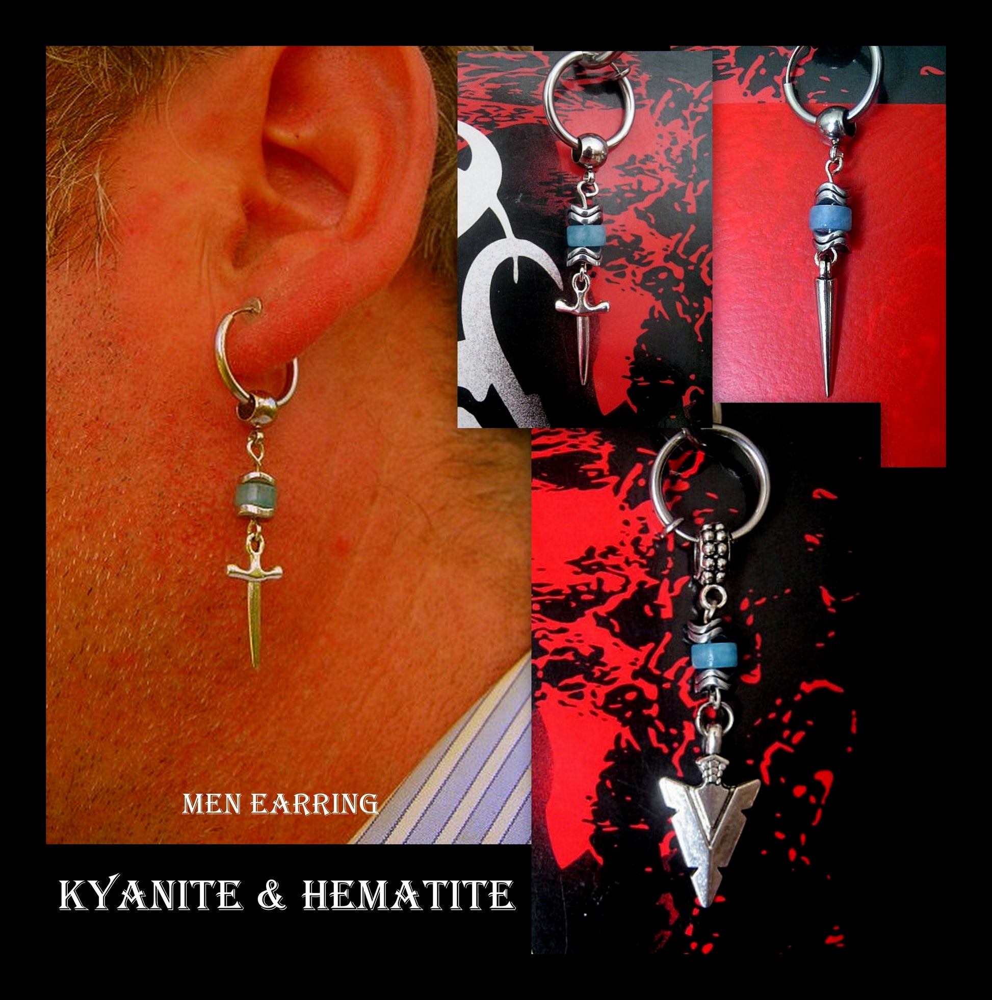 KYANITE stone & Hematite men Earring Hoop/ Clip on dangle unisex mono earring,Spike, Arrow, Sword, Handmade earring men gift