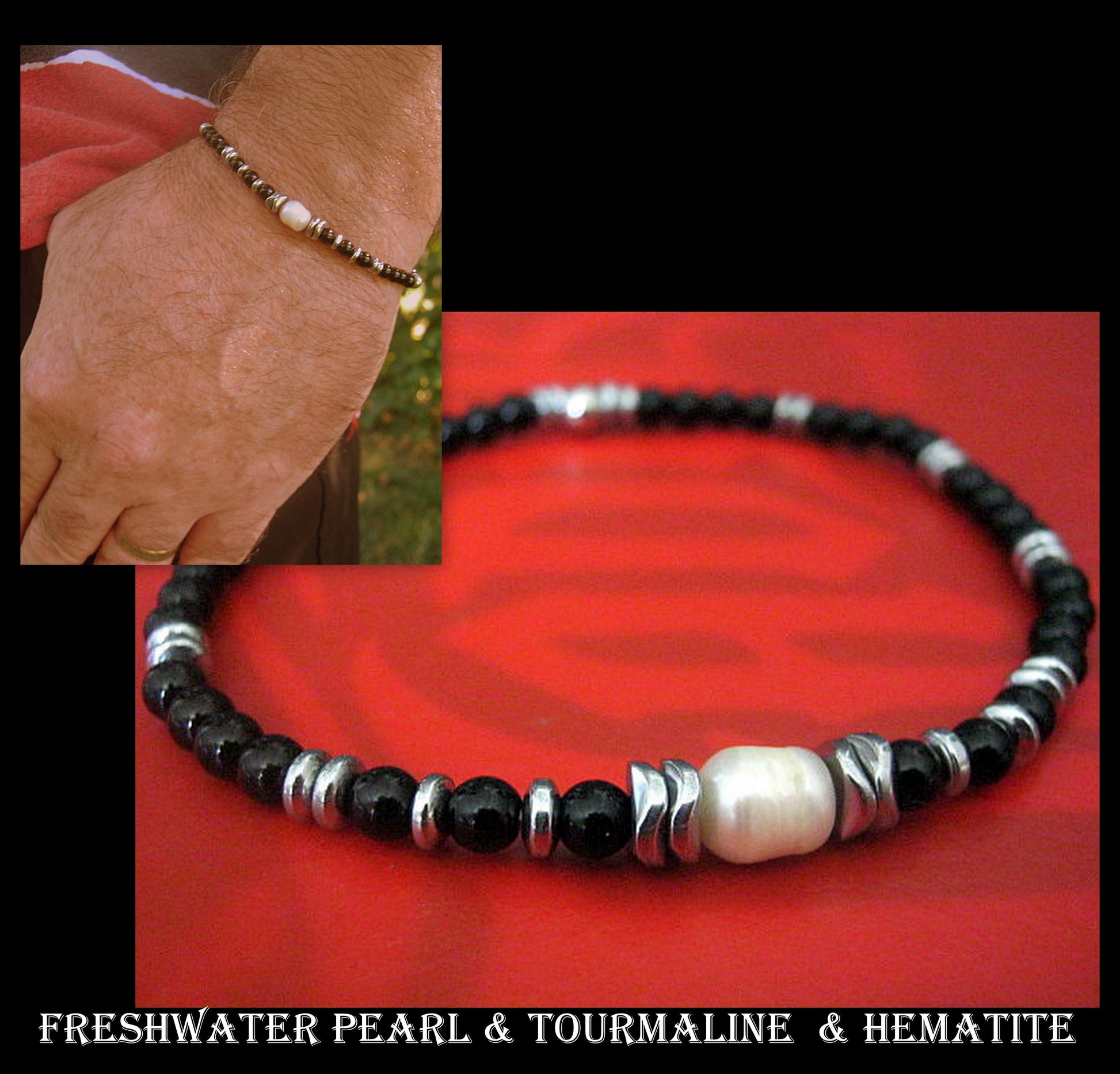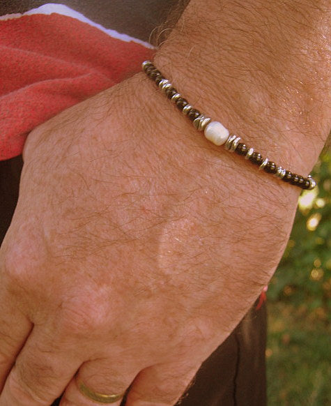 Men Bracelet Freshwater Pearl, Tourmaline & Hematite wave, Spiritual Healing surfer bracelet Men/women/couple gift, handmade bracelet