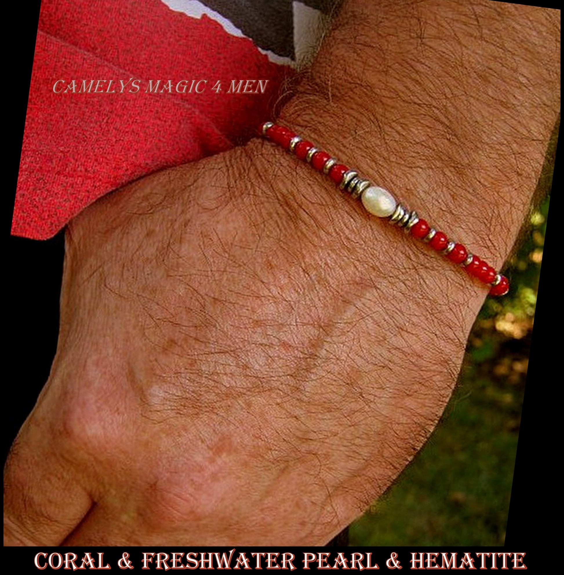 Men Bracelet Freshwater Pearl, Coral & Hematite wave, Red bracelet, Spiritual Healing surfer bracelet Men/women/couple gifthandmade bracelet