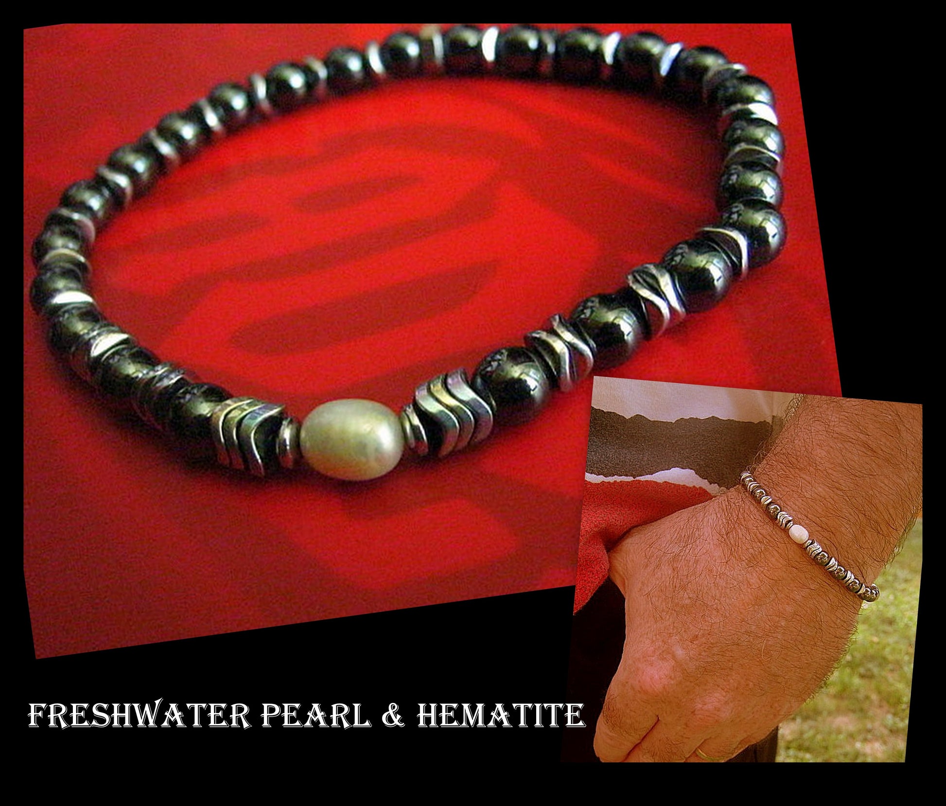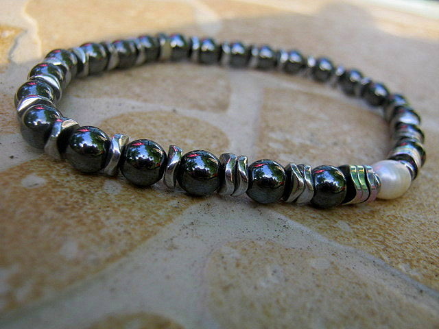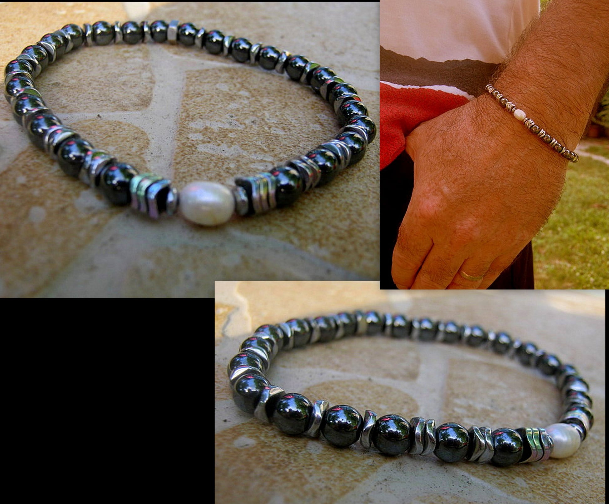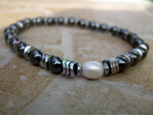 Men Bracelet Freshwater PEARL & black Hematite, Nacre, Black blue pearl, Prosperity Healing surfer bracelet Men/women/couple gift, handmade bracelet