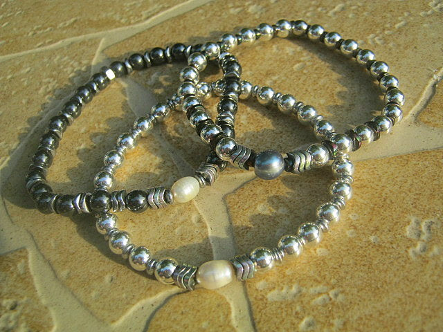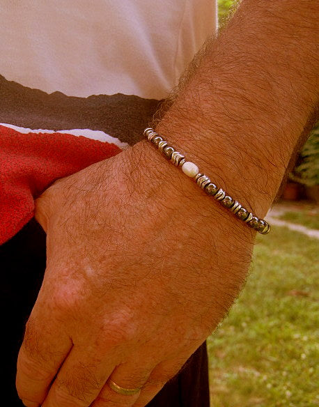 The elegant and protection bracelet - made by hand with natural Freshwater Pearl & hematite beads -silver plated and heishi and sterling silver spacer bead- is a jewelry that brings good luck, health, prosperity and peace of mind - and a great gift idea, or a special treat for yourself. (It can be delivered in a beautiful packaging for gift.