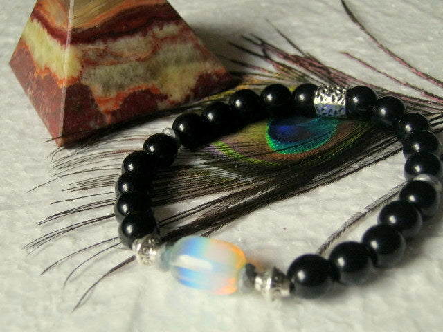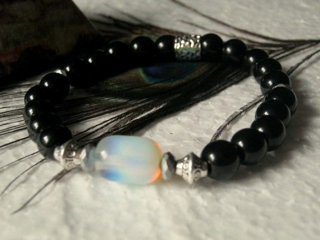 The elegant, sexy and bohemian men and women Bracelet - made by hand with OPAL gemstone (12x16mm), Onyx ( 8mm)and with tibetan silver beads and stainless steel accessories - magic jewelry that brings good luck, health, prosperity and peace of mind - is a great gift idea or a special treat for yourself. (It can be delivered in a beautiful packaging for gift)