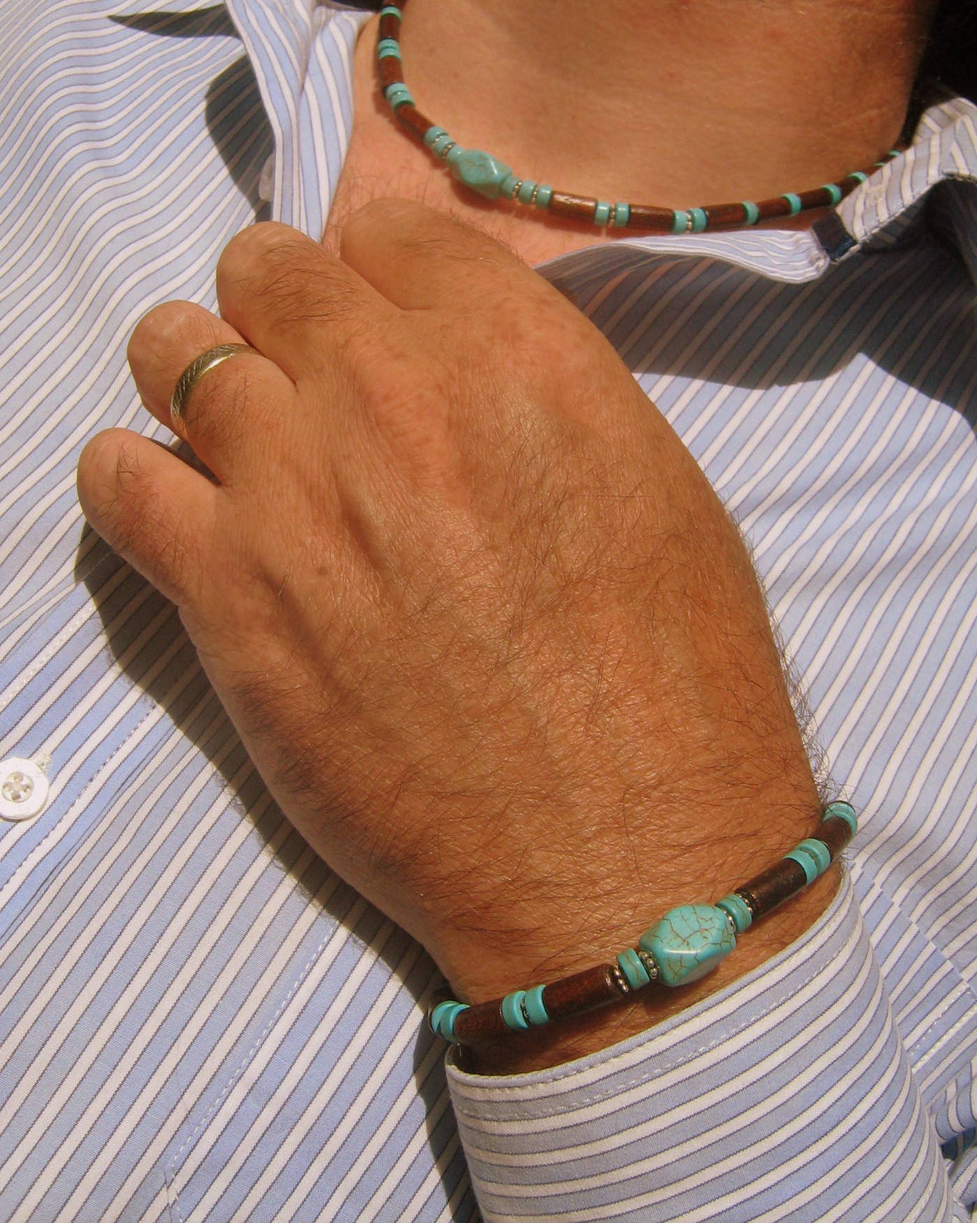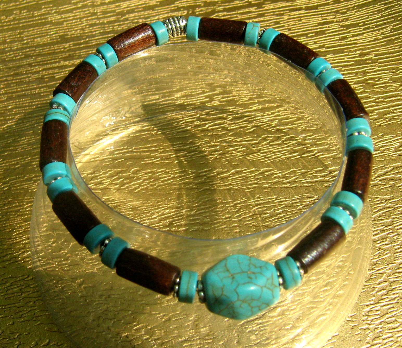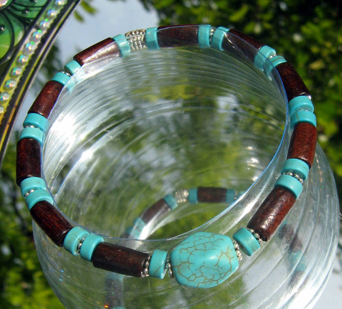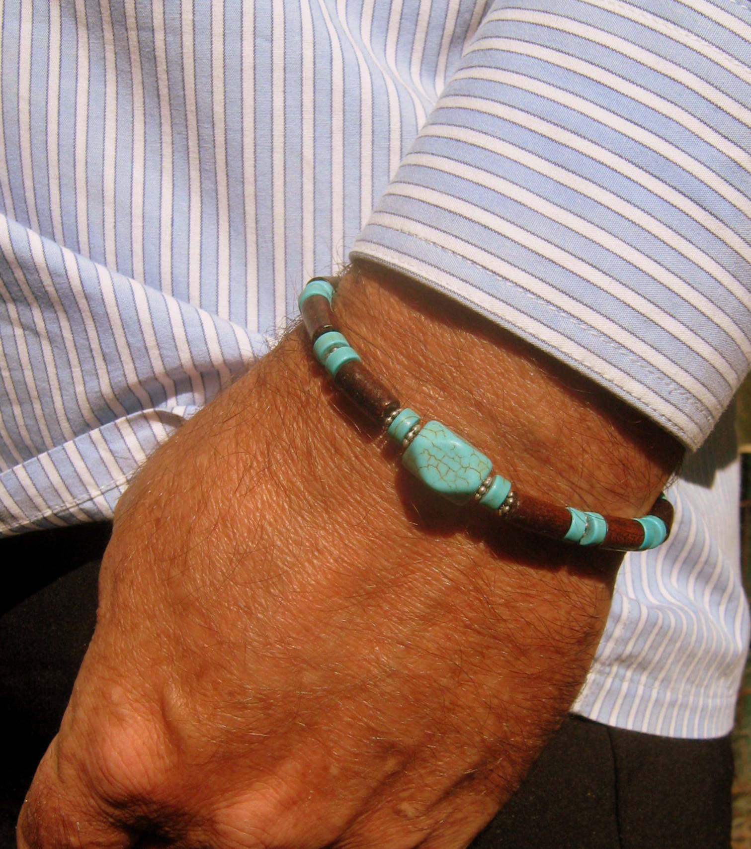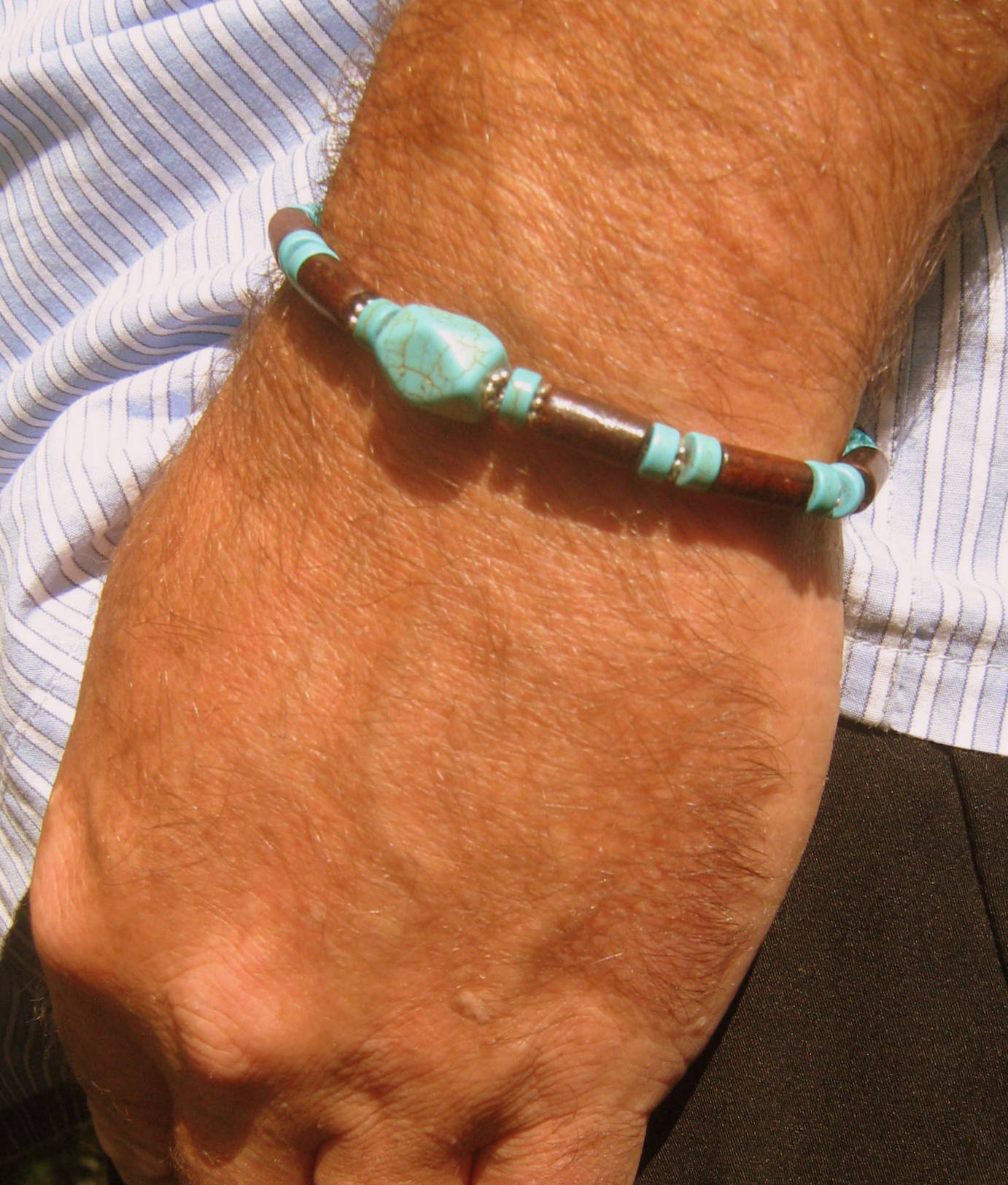 Men TURQUOISE stone bracelet, brown Coco wood heishi beads Onyx Hematite Healing stone, Tribal handmade bracelet men gift