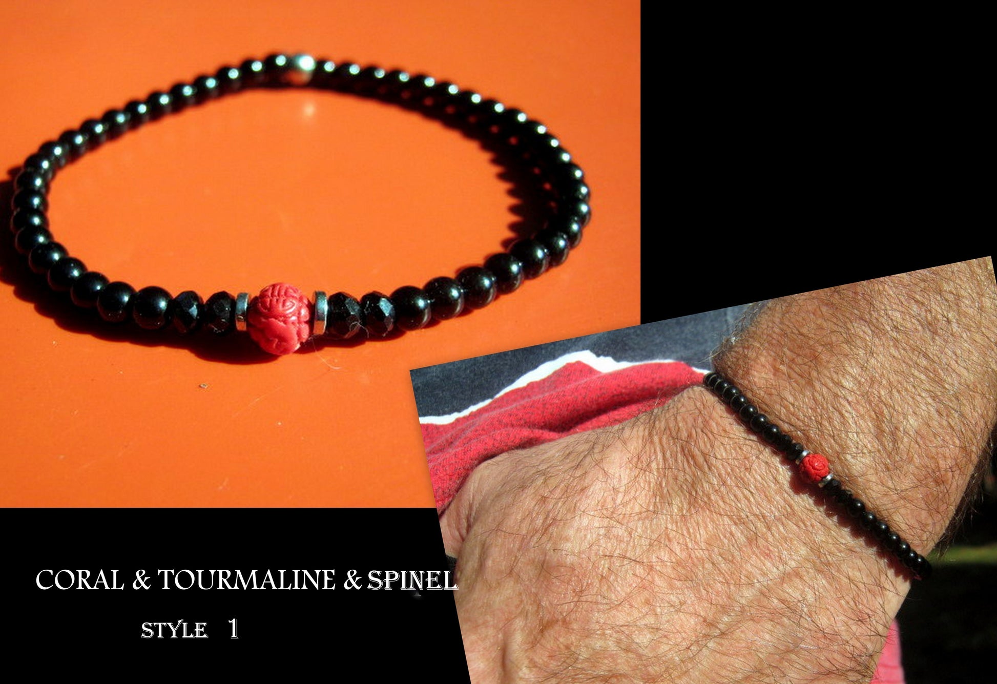 -1 bracelet -style 1 - Coral /protection mantra carved, Spinel Black Diamond and Tourmaline,