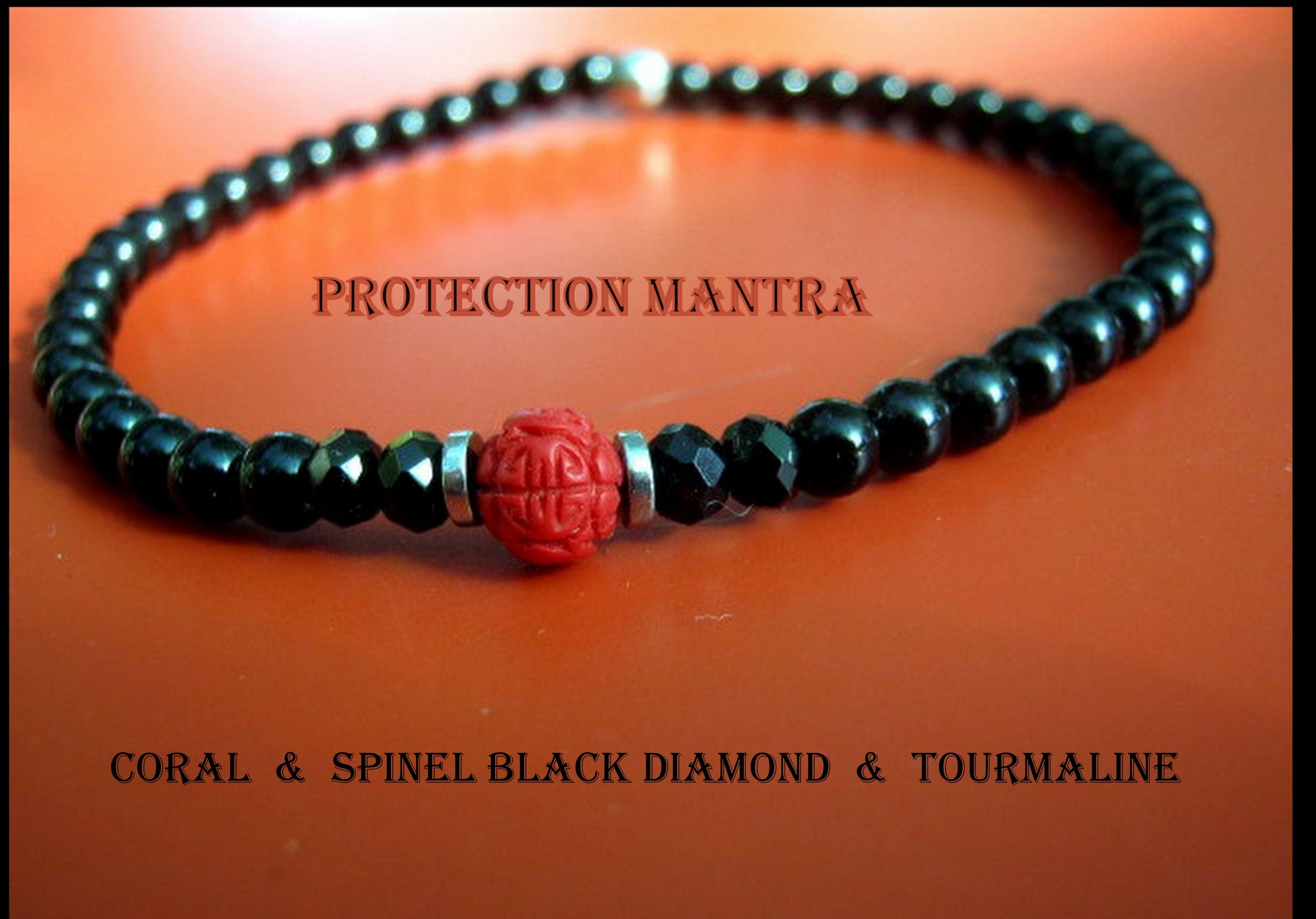 The elegant, sexy and spiritual men and women minimalist Bracelet - made by hand with tiny gemstones (4 mm), carved Coral with protection mantra & Tourmaline & Spinel black diamond and sterling silver 925 bead - jewelry that brings good luck, health, triple protection and peace of mind - is a great gift idea or a special treat for yourself. ( delivered in a beautiful packaging for gift)