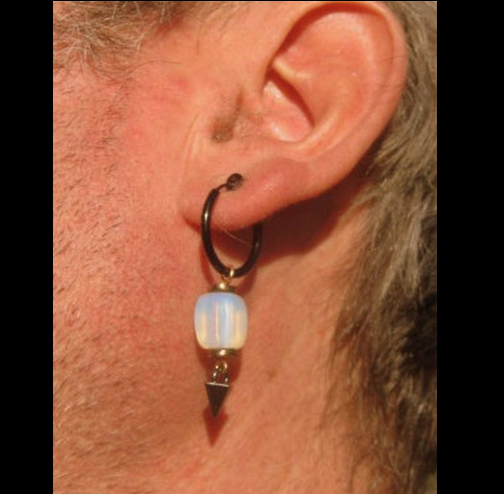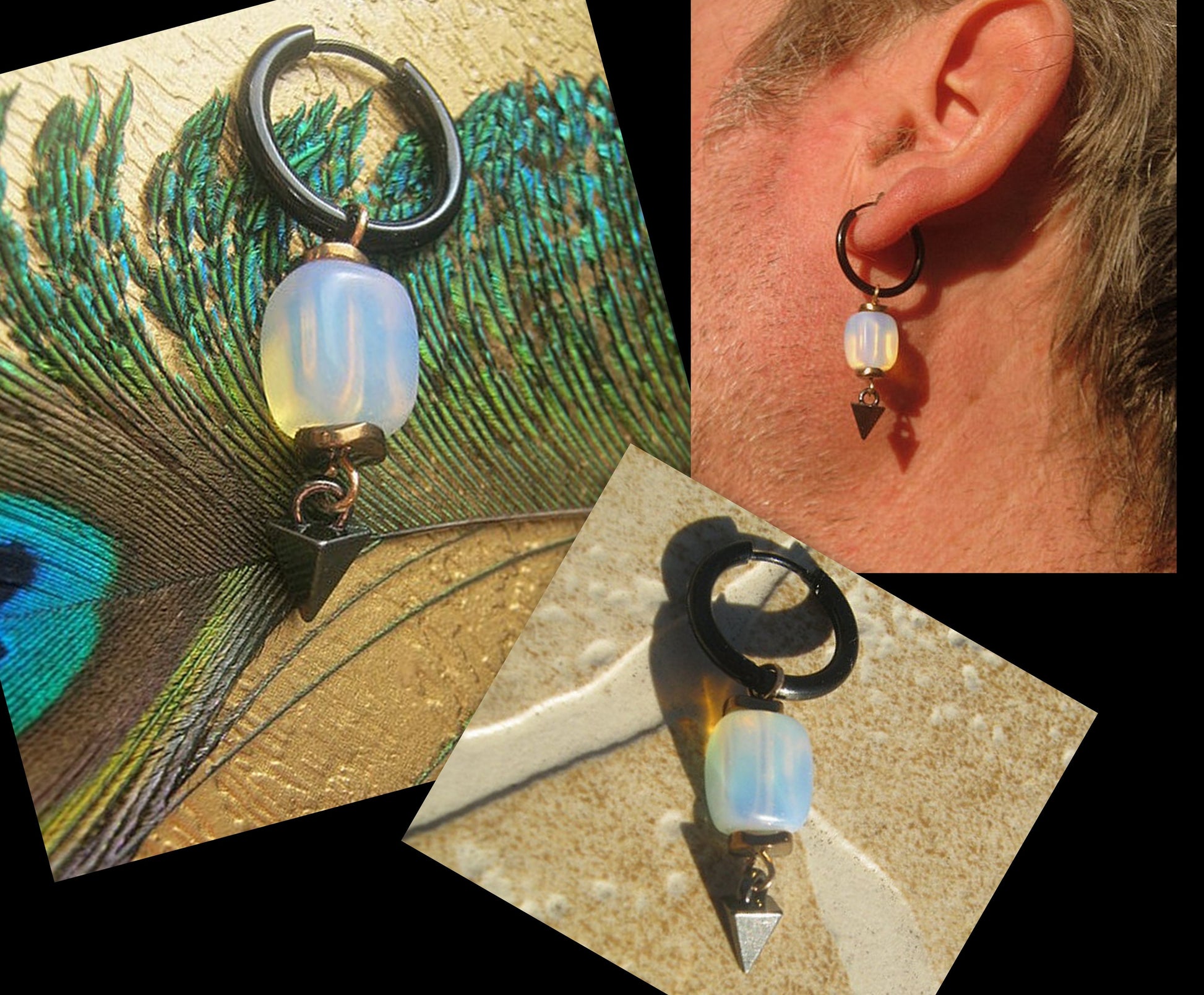 Men Earring OPAL stone & Hematite stone, Dangle Hoop/ clip on, stainless steel, Handmade earring men gift