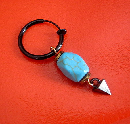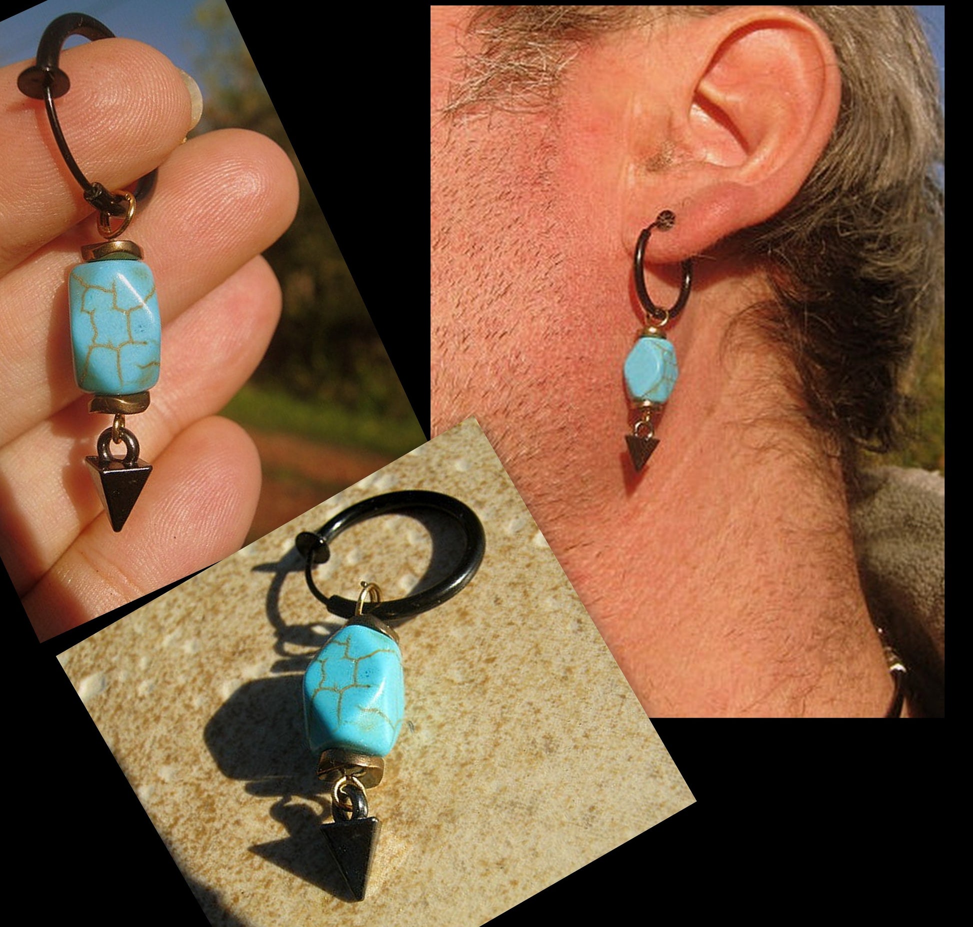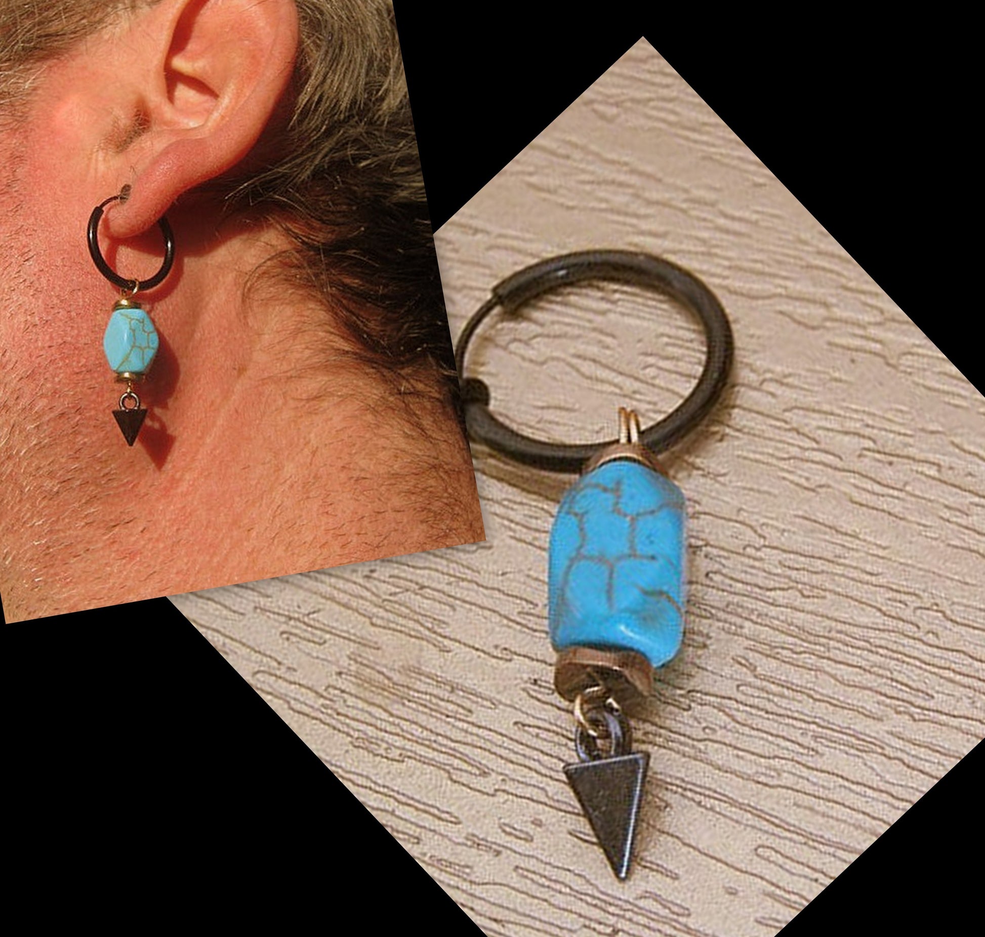 Men Earring TURQUOISE stone & Hematite stone, Dangle Hoop/ clip on, stainless steel, Handmade earring men gift