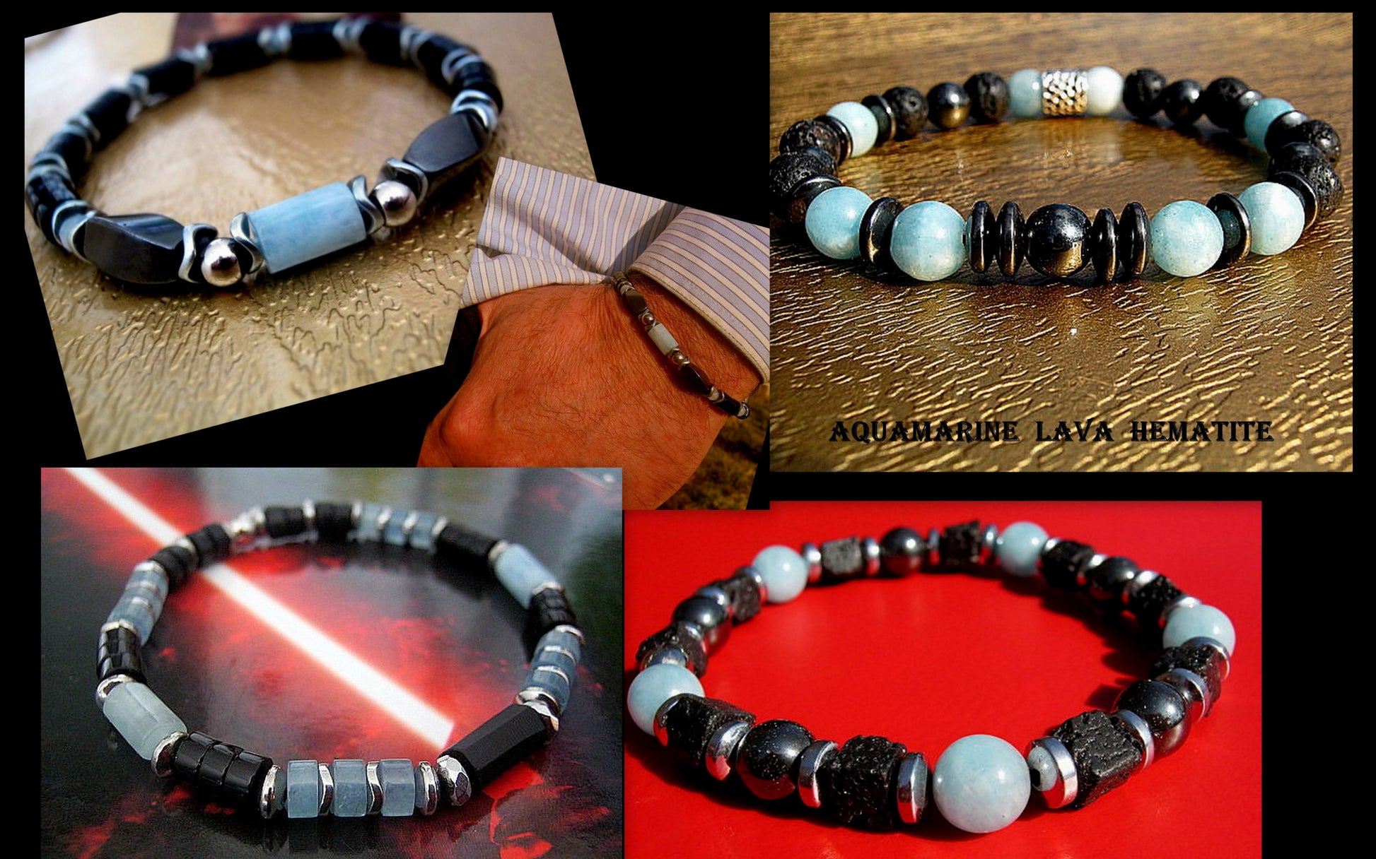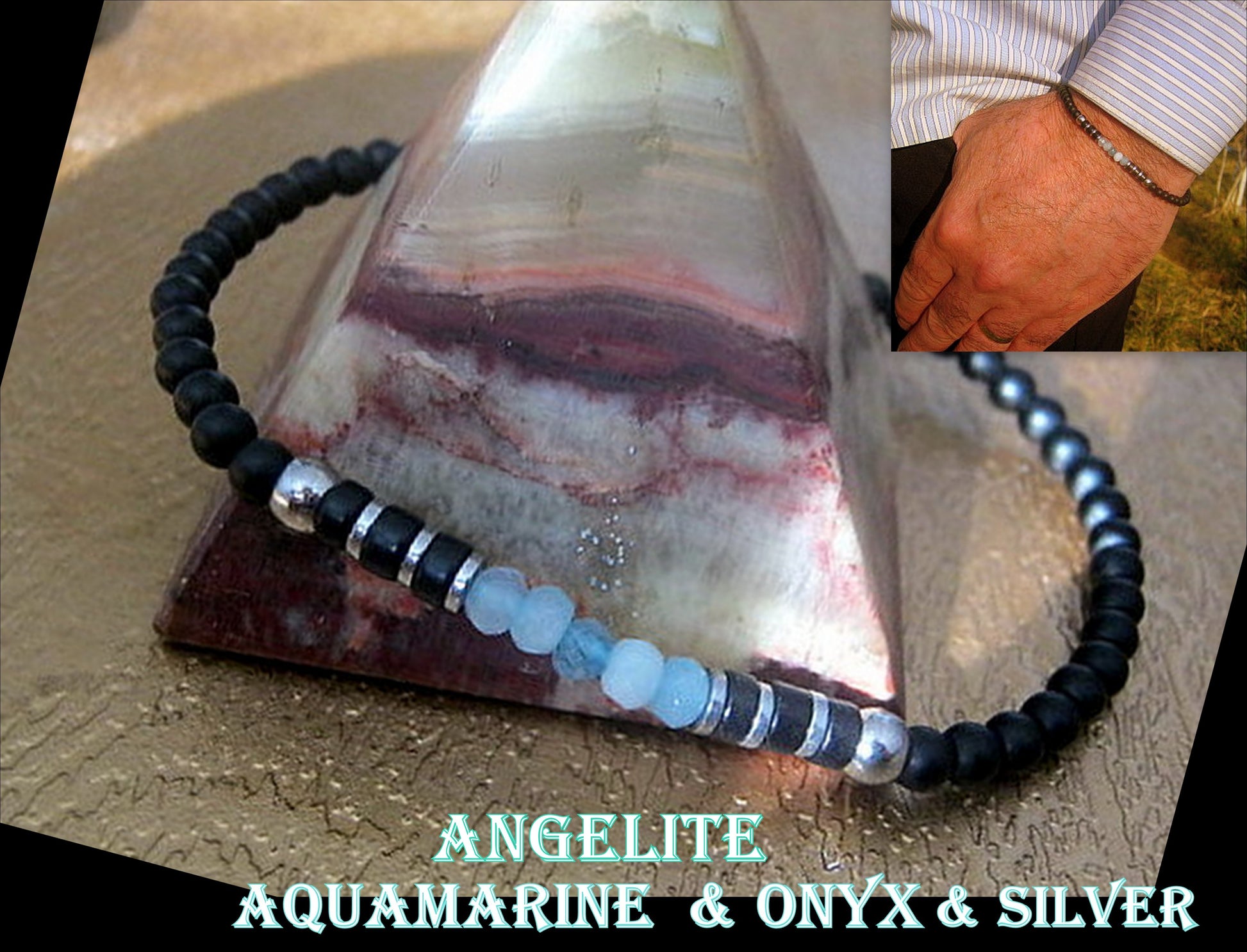 -bracelet style 3- ANGELITE & AQUAMARINE,Onyx ,silver Hematite & argent st.925 bead