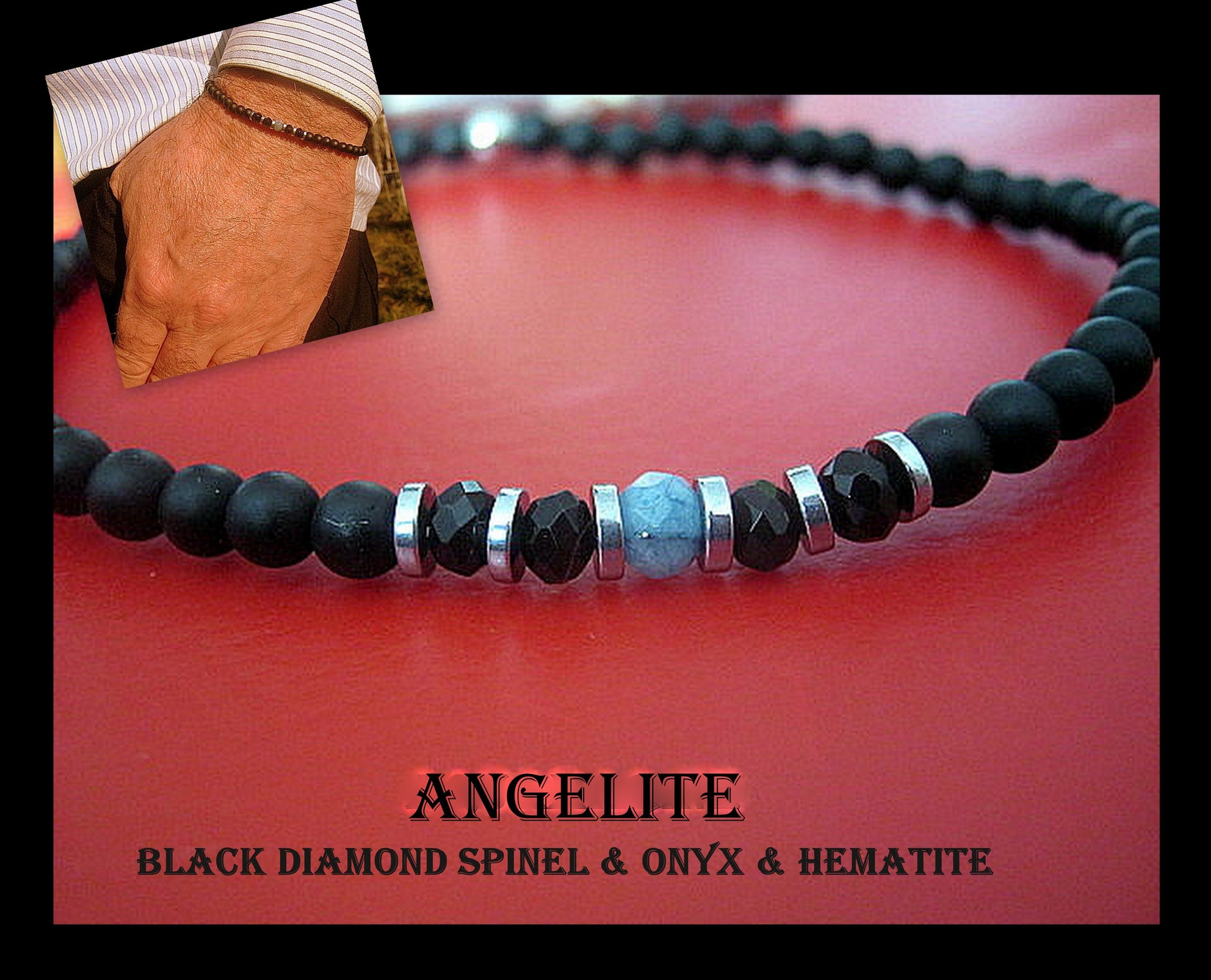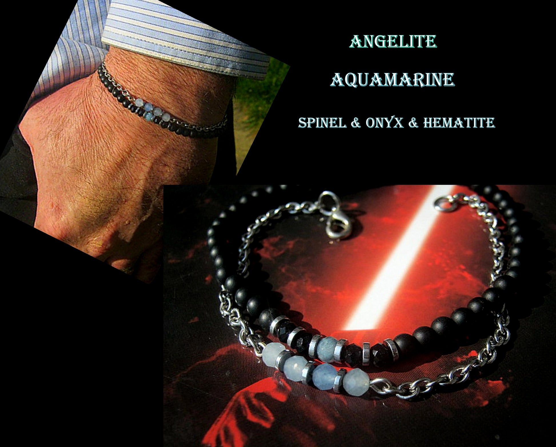 -bracelet style 1 -ANGELITE ,Spinel- black Diamant , Onyx & silver Hematite & argent st.925 bead
