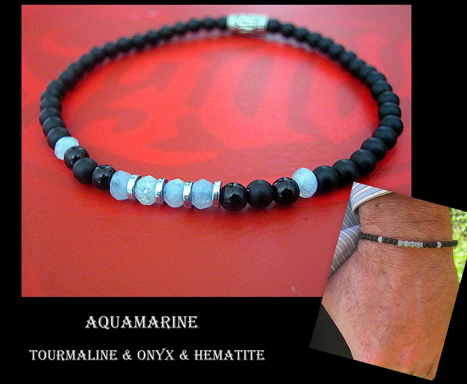 Men tiny Angelite AQUAMARINE Onyx Tourmaline Black Diamond Spinel Hematite bracelet, protection precious stone handmade slim bracelet men gift