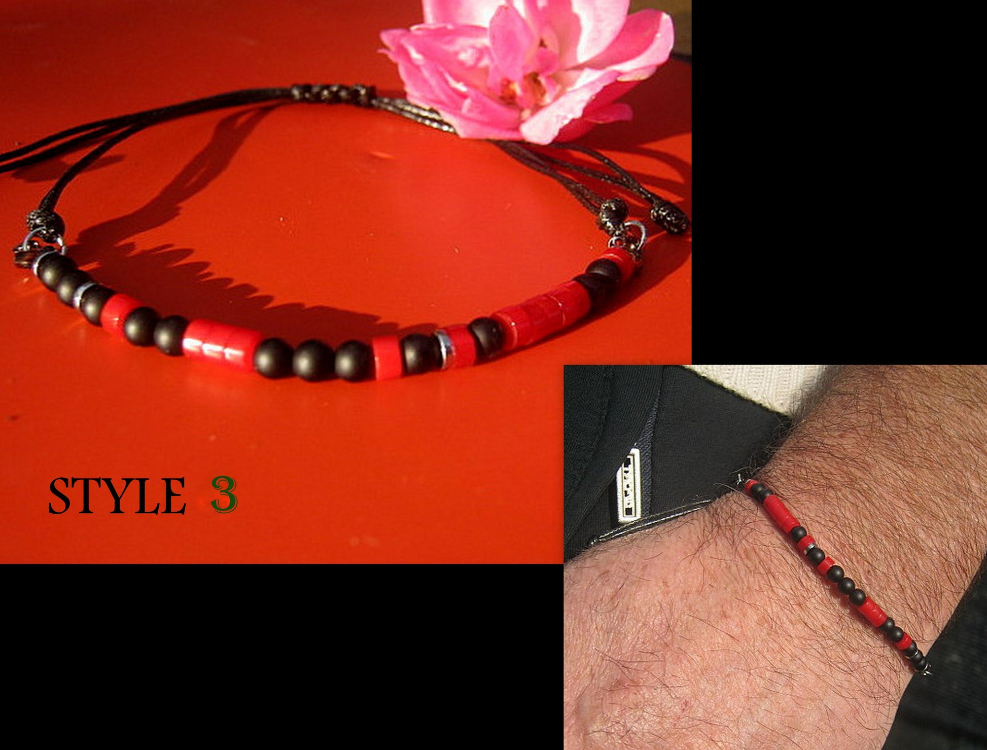 -1 bracelet -cord black, Onyx black & coral red heishi -style.3