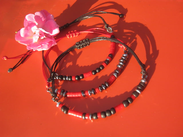 -1 bracelet - cord black, Hematite faceted black &silver, and coral red heishi -style.1