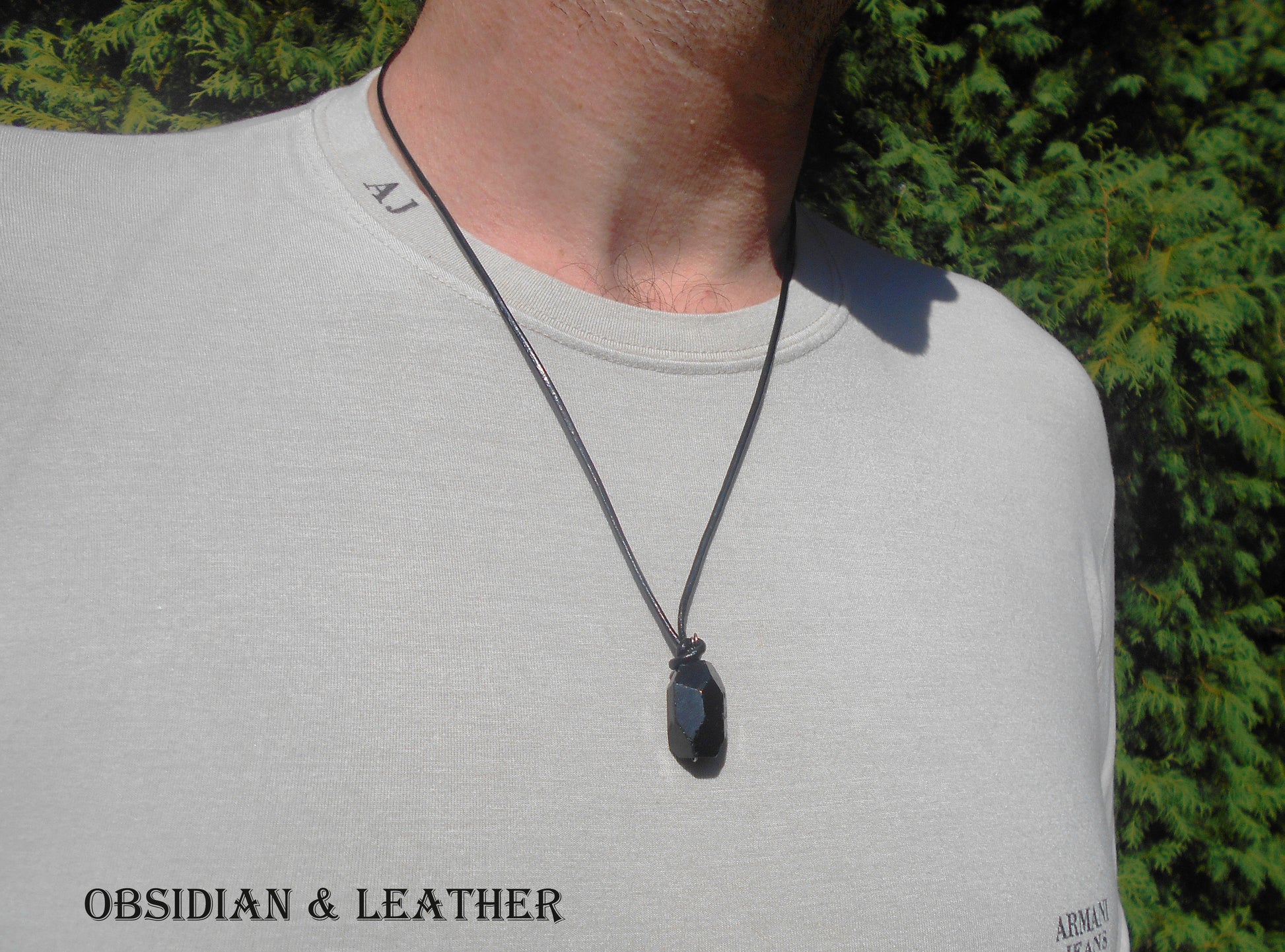 OBSIDIAN stone men pendant long Necklace EMF Protection, healing crystal, silver chain stainless steel/cord/leather handmade necklace Men /couple Gift