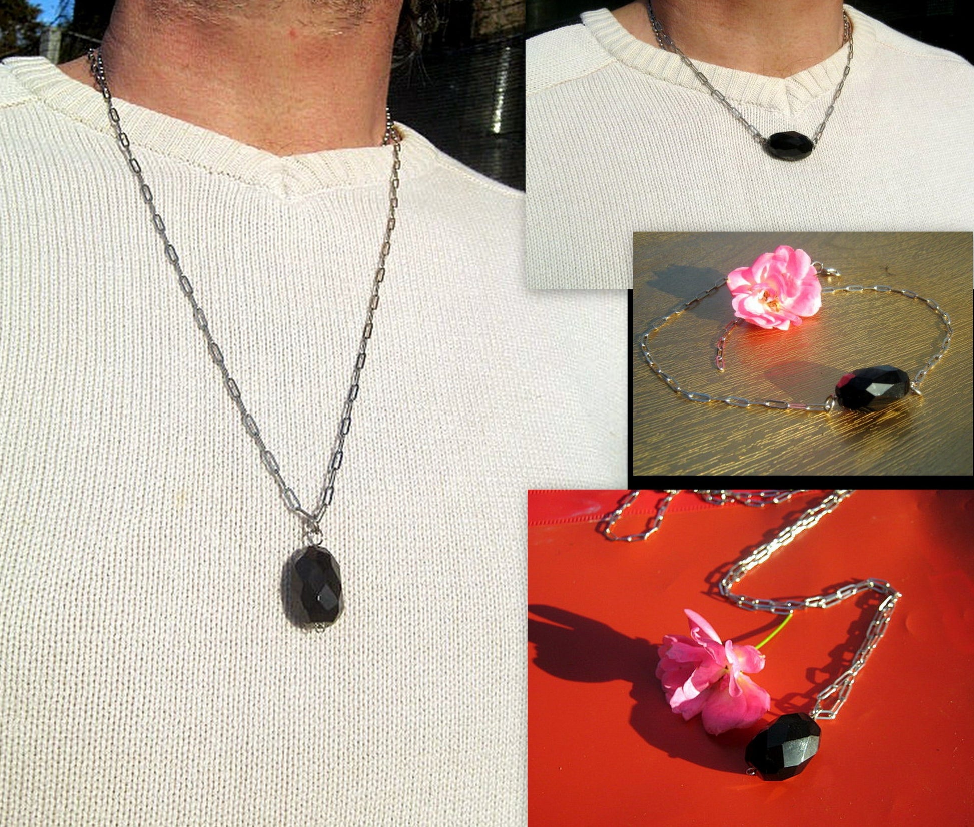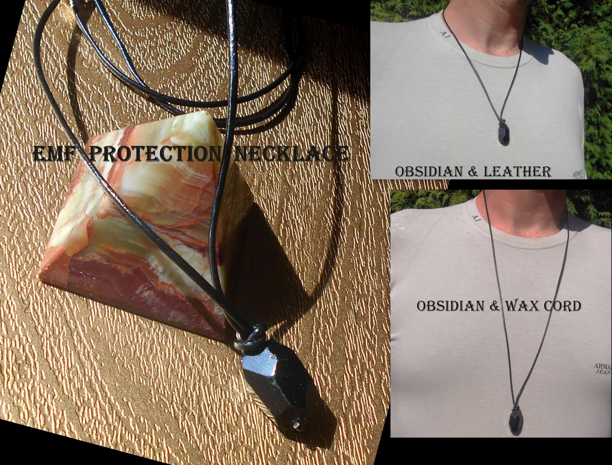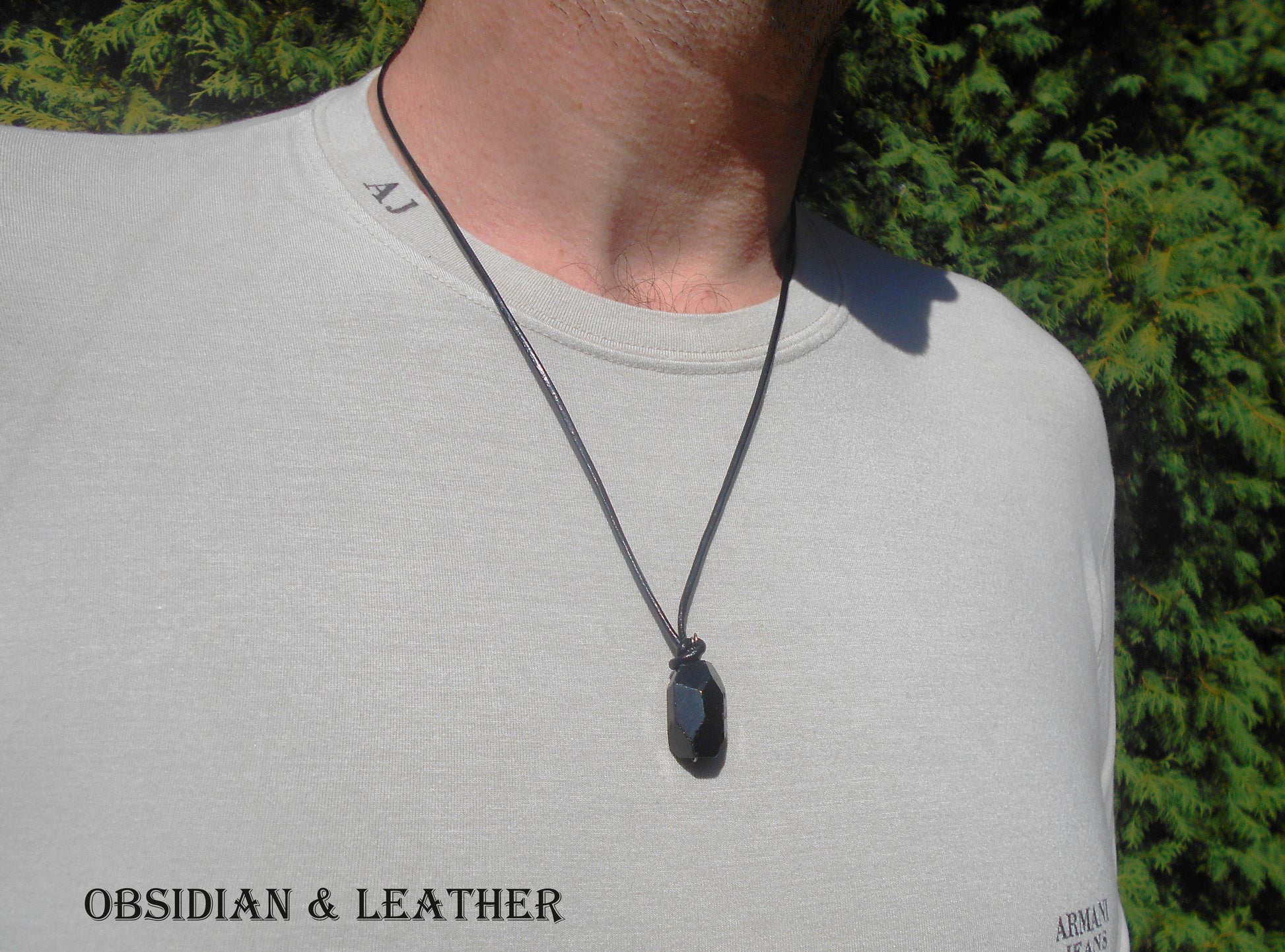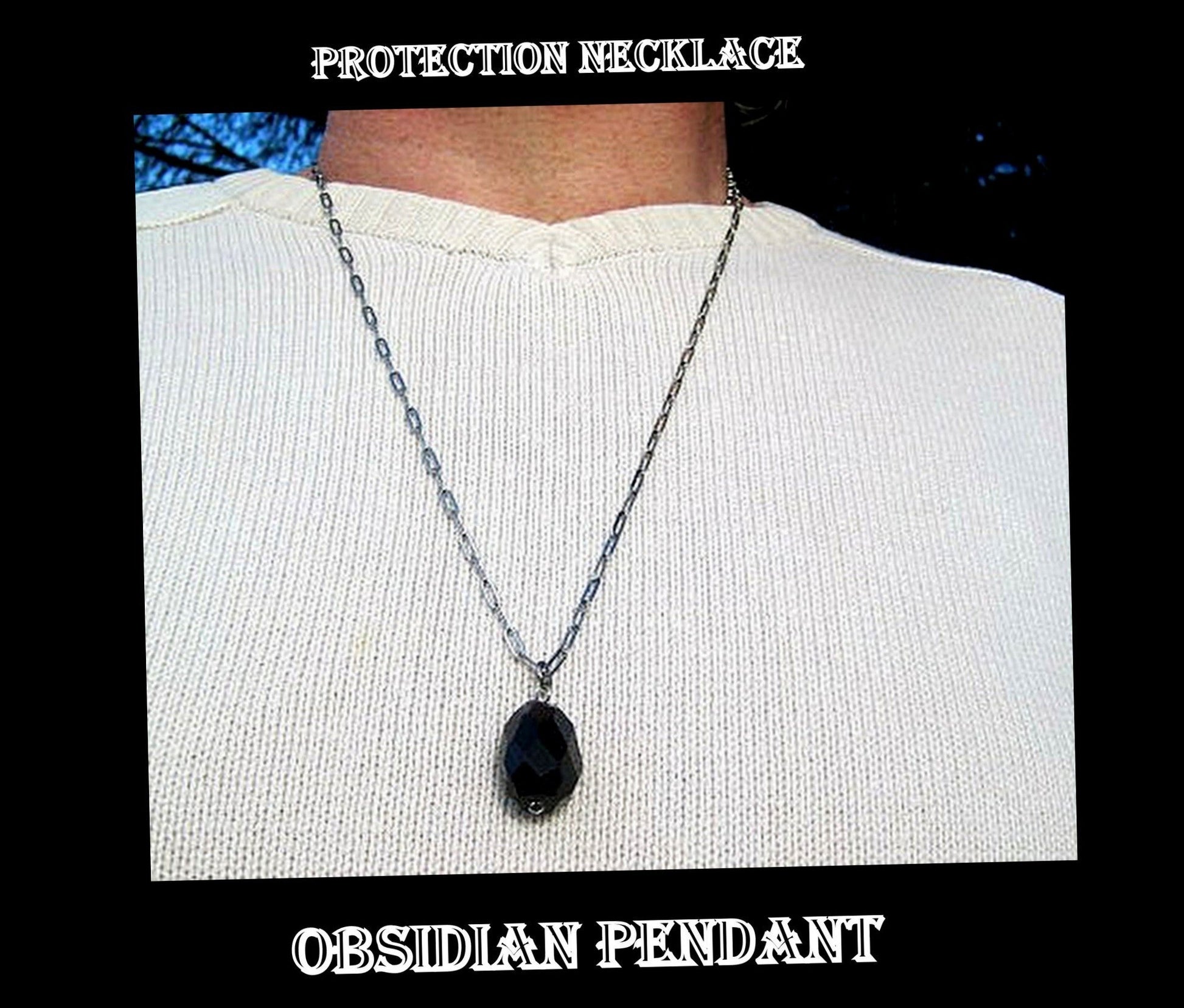 OBSIDIAN stone men pendant long Necklace EMF Protection, healing crystal, black cord/ leather/ silver chain stainless steel handmade necklace Men /couple Gift