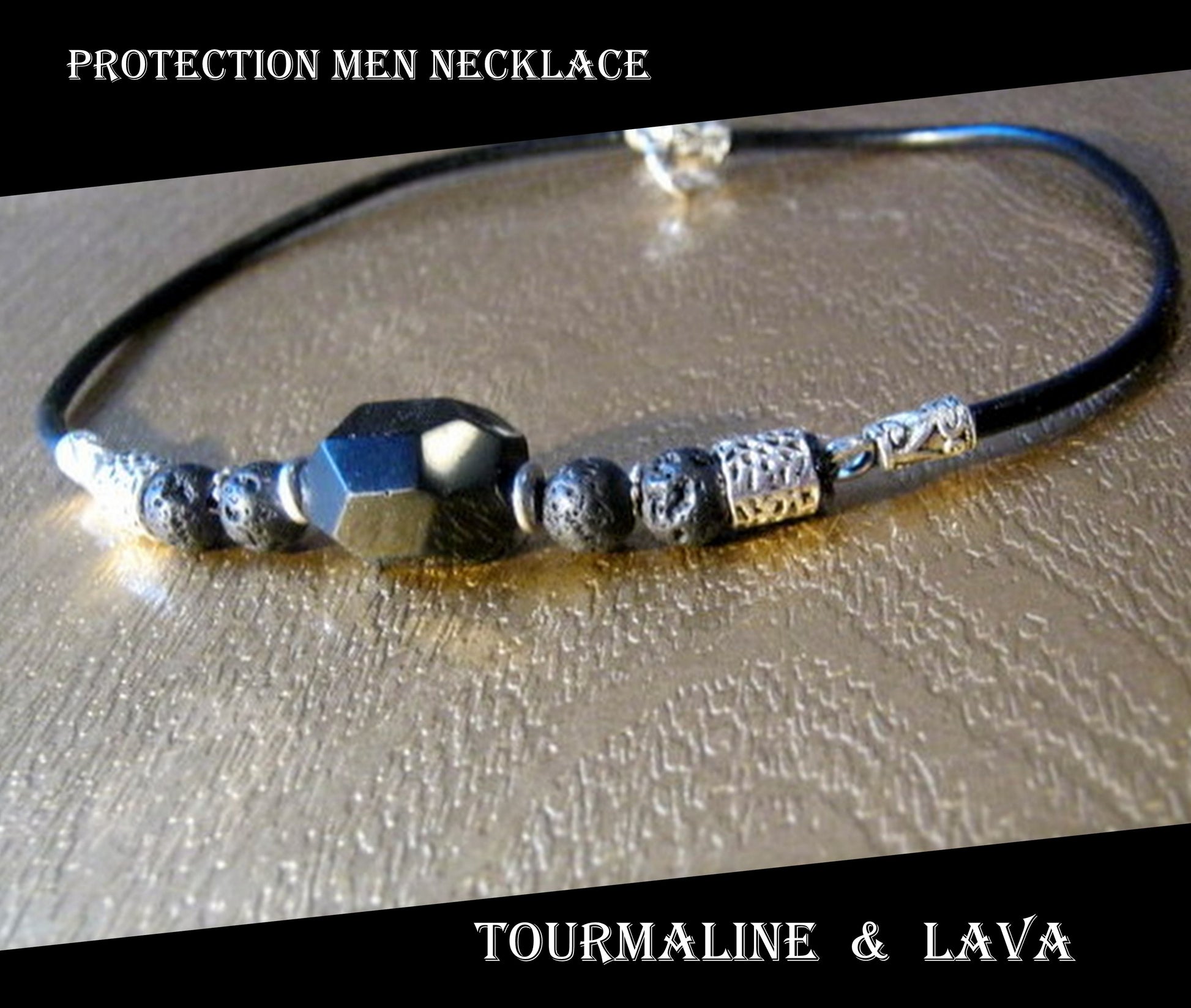 TOURMALINE Lava Rutilated quartz Citrine Tiger Eye stone men Necklace EMF Protection, healing crystal, black leather handmade necklace Men /couple Gift