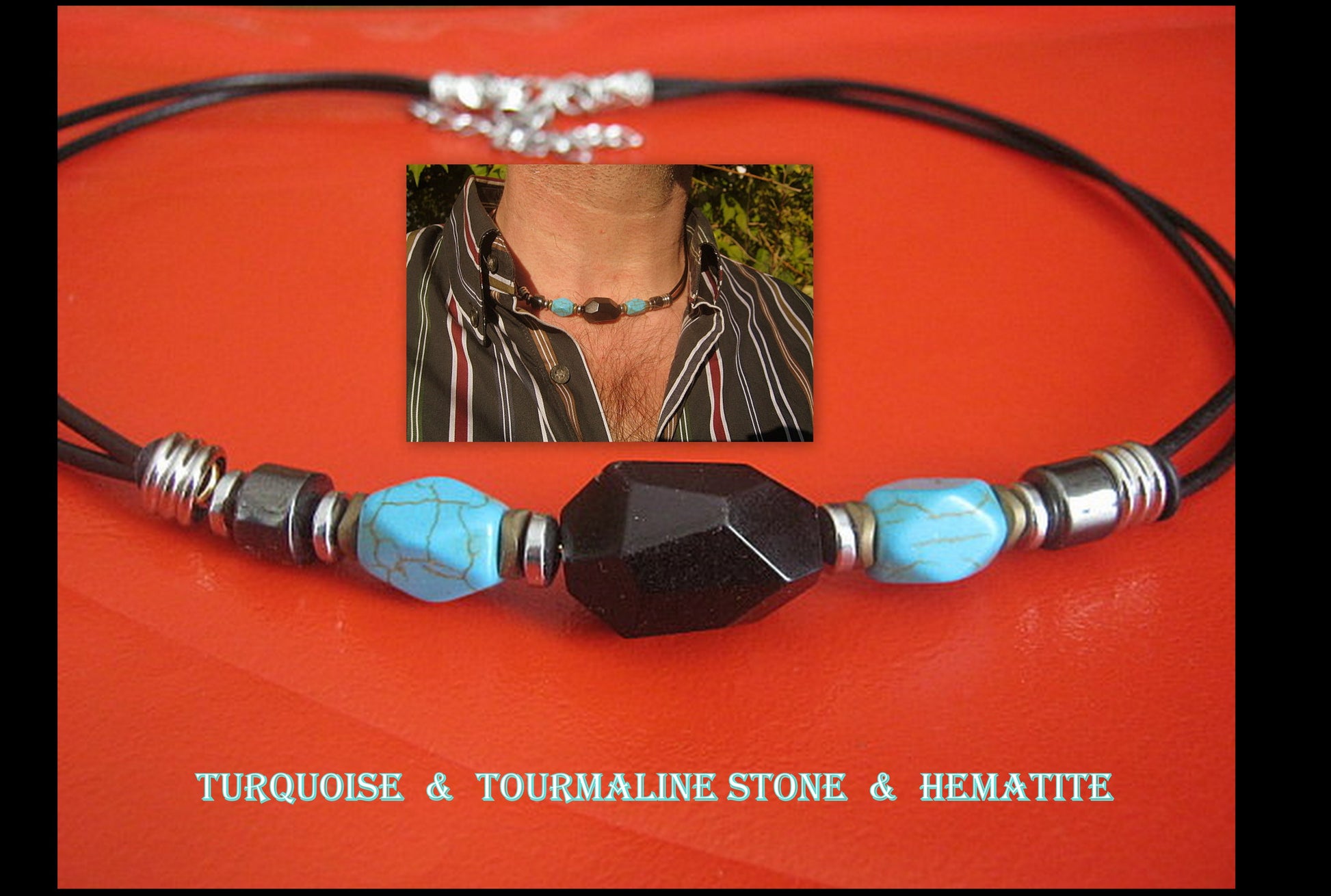 TOURMALINE & TURQUOISE stone men pendant long Necklace EMF Protection, healing crystal, leather, handmade necklace Men /couple Gift