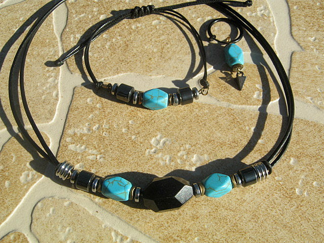 The elegant magic and protection NECKLACE is made by hand, combine with elegance black leather with faceted TOURMALINE stone 20-30 mm,Turquoise and black, silver & gold Hematite, stainless steel accesorry- jewelry that brings good luck, health, prosperity and peace of mind - is a great gift idea, or a special treat for yourself. (It is delivered in a beautiful packaging for gift).